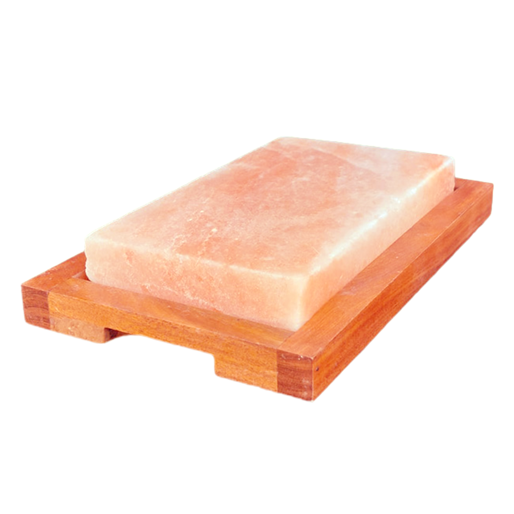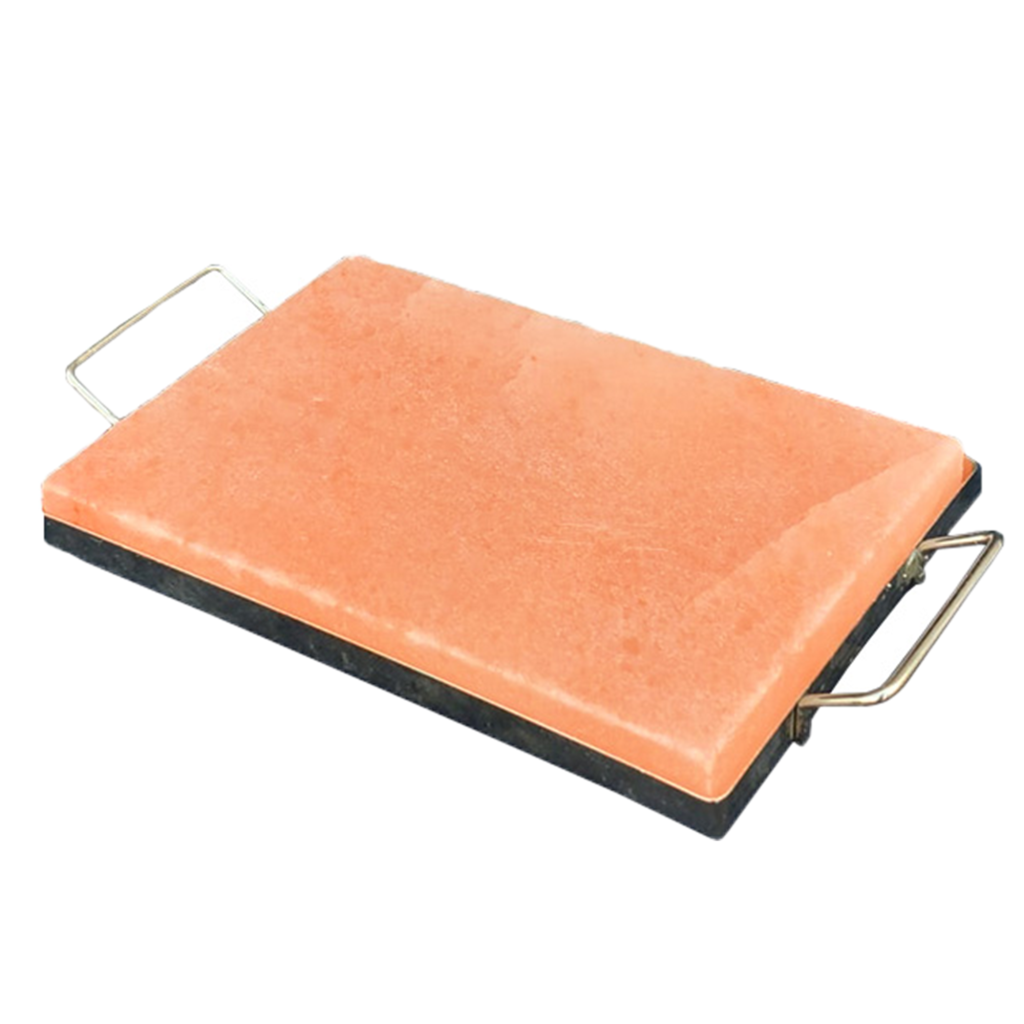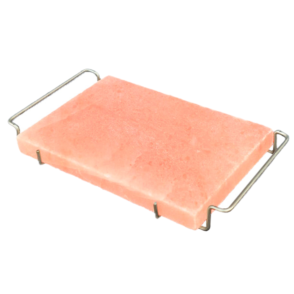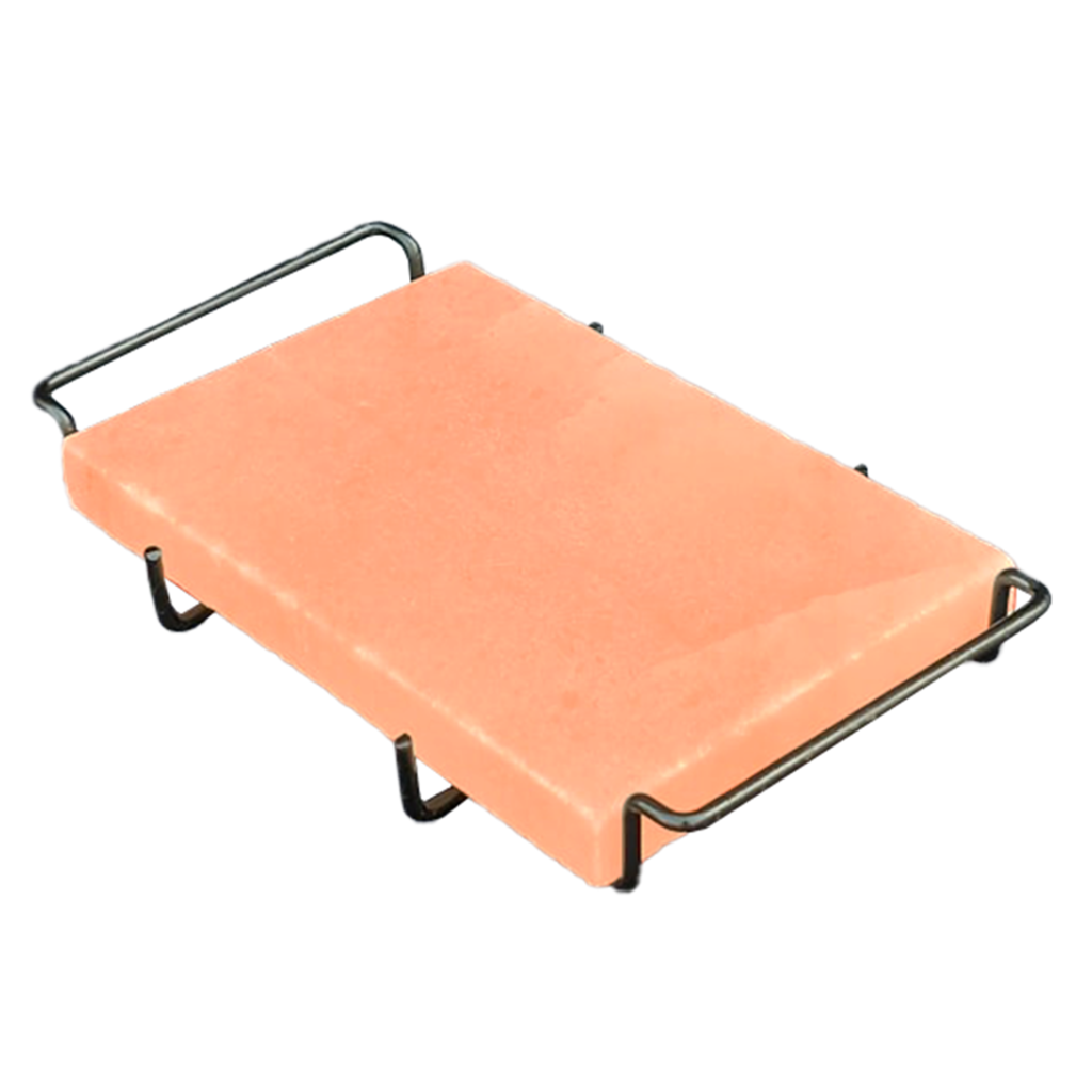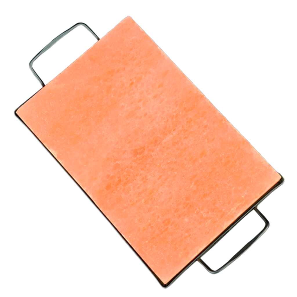 A 9.5×5.5×1″ salt cooking tile with an iron base, ideal for grilling and elegant presentation.