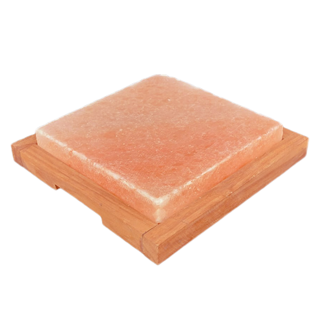 An 8x8x1″ pink salt cooking tile with a wooden base, perfect for grilling and serving food.