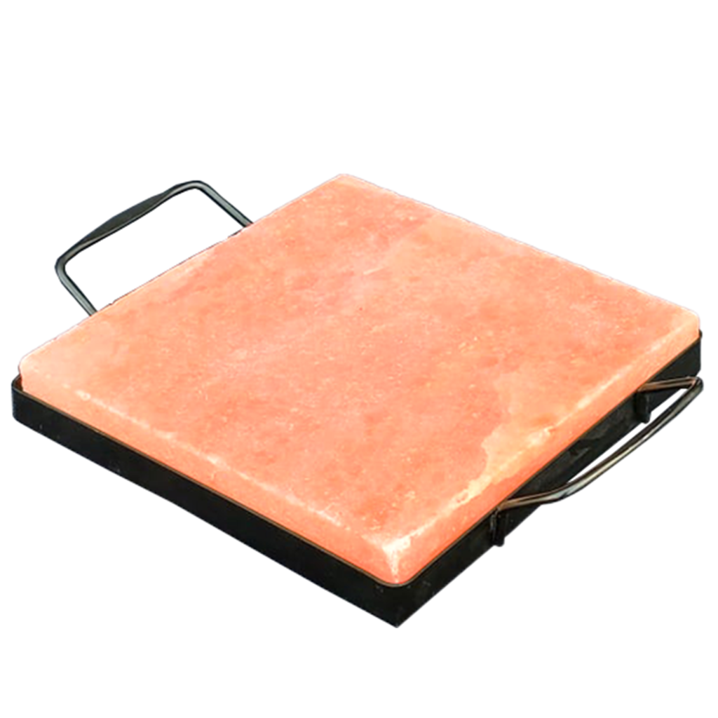 An 8x8x1″ salt cooking tile with an iron base, perfect for grilling and sophisticated serving.