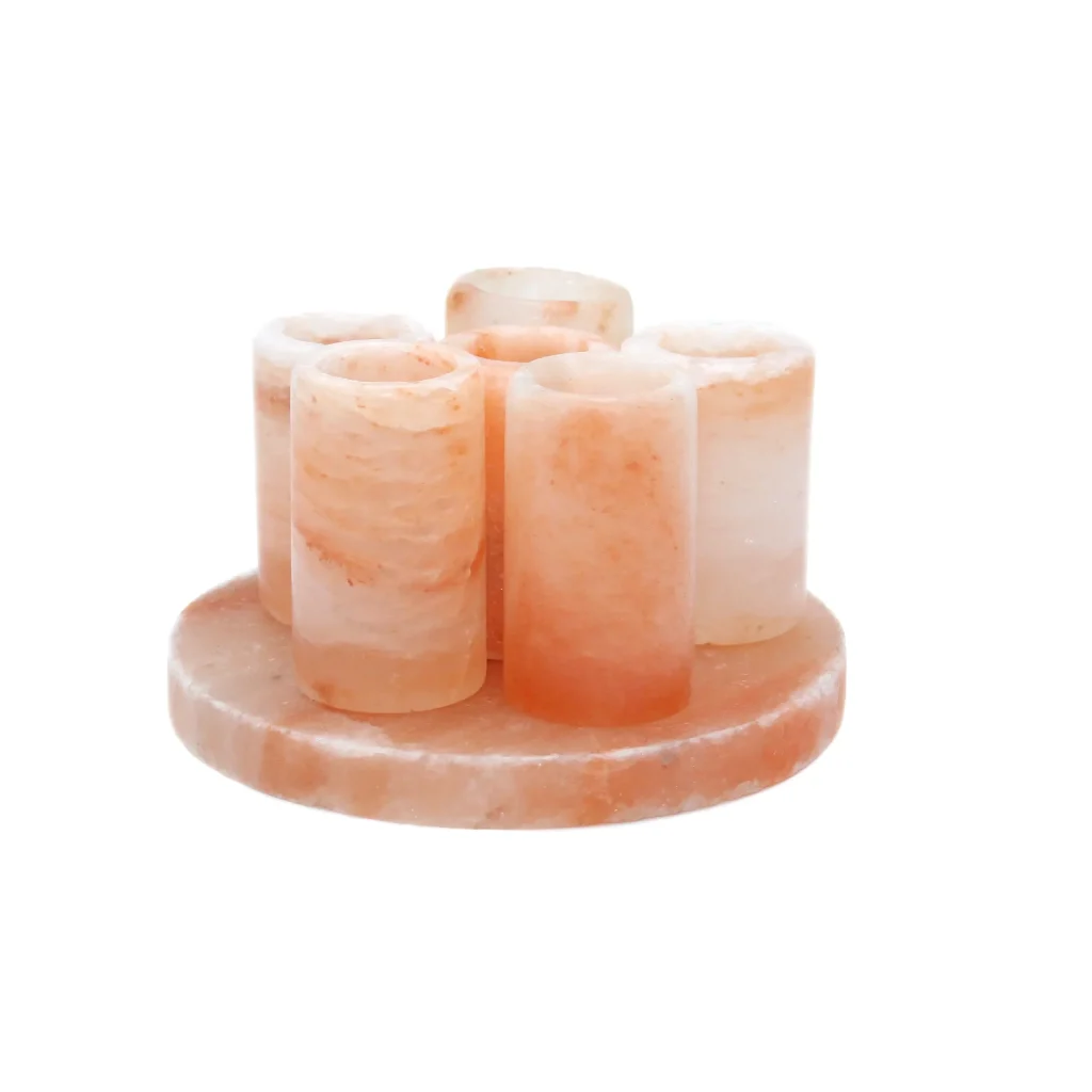 Pink salt tequila shot glasses with a round plate, enhancing the flavor and presentation of your drinks.